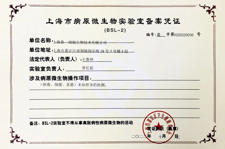 为响应国务院《病原微生物实验室生物安全管理条例》以及《实验室-生物安全通用要求》(GB19489-2008)等文件要求,威客电竞细胞研发实验室在经过布局整改、文件完善、人员培训等一系列准备工作后,于2022年9月3日向上海市嘉定区卫健委提交了生物安全二级实验室备案申请书,次月该申请审核通过 。