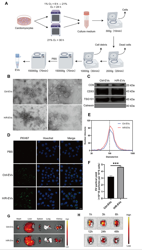 研究起首成功分手并表征了两种心肌细胞来历的外泌体:常氧对比外泌体Ctrl-EVs与缺氧复氧处置后的外泌体H/R-EVs。透射电镜显示二者均呈典型类外泌体球形布局,Western blot验证CD9、CD63、TSG101等标记物阳性,无钙联卵白污染;纳米颗粒追踪阐发显示粒径集中在30-200纳米,合适外泌体特点。体表里尝试均证实,H/R-EVs可被巨噬细胞高效摄取,且心肌局部打针后能长时候滞留,为其阐扬生物学感化奠基根本。