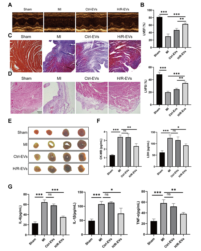 在小鼠心梗模子中,H/R-EVs揭示出显著的心庇护感化。超声心动图显示,H/R-EVs处置组的左心室射血分数和短轴缩短率较心梗组、Ctrl-EVs组较着升高;Masson三色染色显示心肌纤维化水平减轻,HE染色提醒炎症浸润削减,TTC染色证实梗死面积缩小;血清中间肌毁伤标记物CK-MB、LDH和促炎因子IL-6、IL-1β、TNF-α程度均显著下降,注解H/R-EVs能有用减轻心肌毁伤和全身炎症反映。
