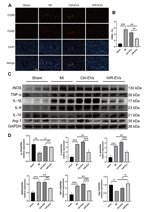 心肌组织免疫阐发显示,心梗后促炎表型M1巨噬细胞(CD86+F4/80+)数目显著增添,而H/R-EVs医治后M1巨噬细胞比例降落,抗炎表型标记物IL-10、Arg-1表达升高,证实H/R-EVs可调控巨噬细胞极化均衡,改良局部炎症微情况。
