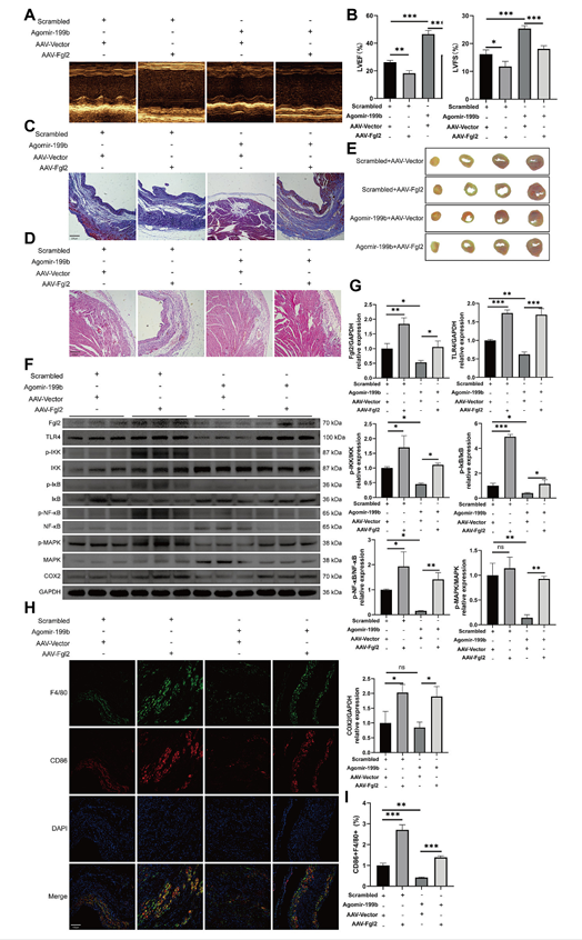 图5 miR-199b-3p经由过程靶向纤维卵白原样卵白2减轻心梗小鼠的心肌毁伤和炎症反映